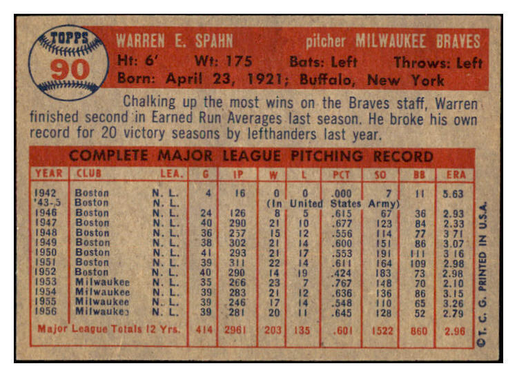 1957 Topps Baseball #090 Warren Spahn Braves EX-MT 529060