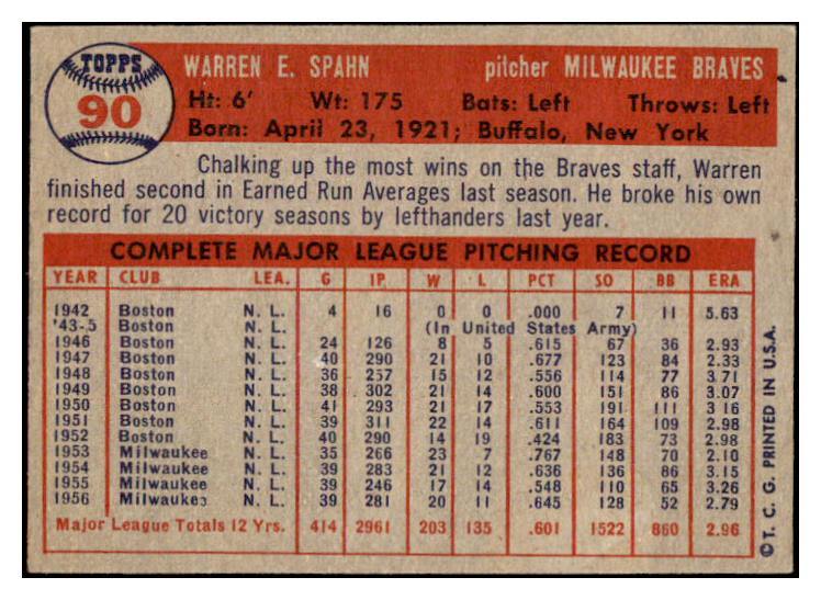 1957 Topps Baseball #090 Warren Spahn Braves EX-MT 529064
