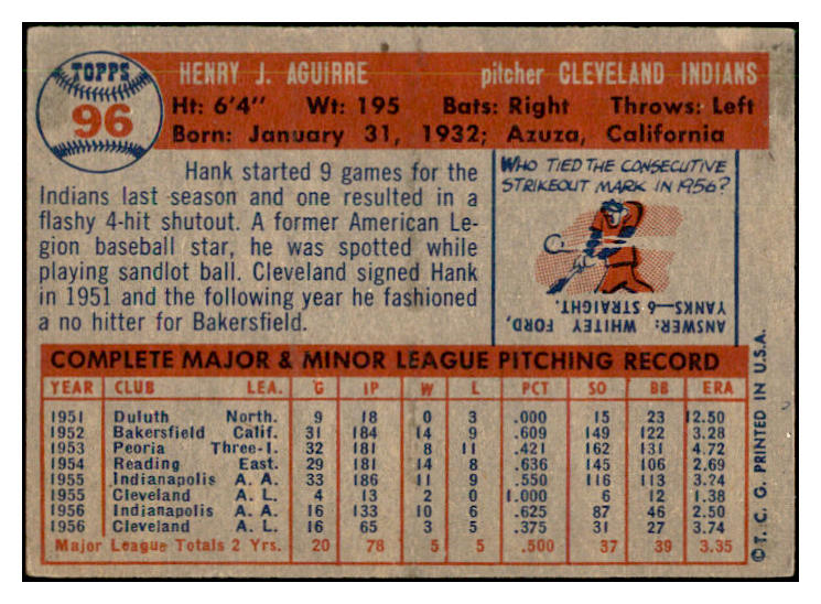 1957 Topps Baseball #096 Hank Aguirre Indians EX-MT 535429