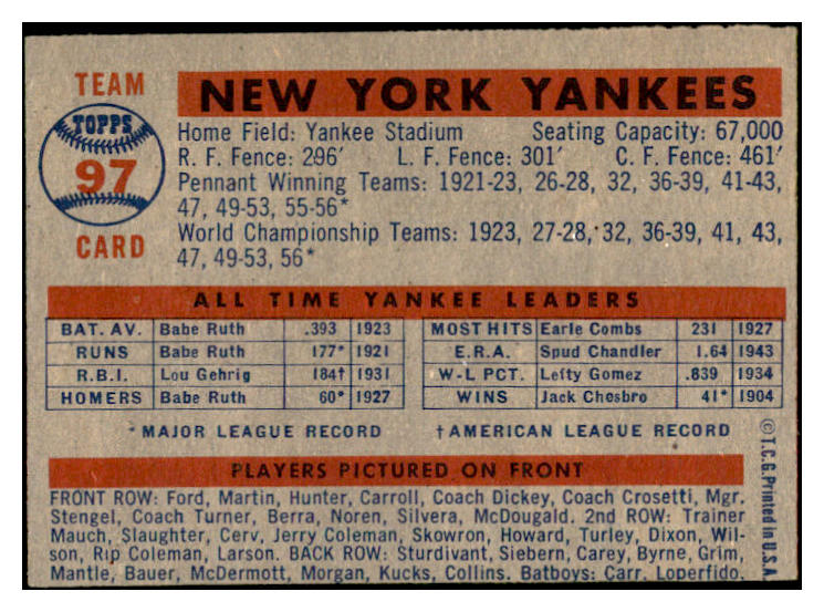 1957 Topps Baseball #097 New York Yankees Team EX-MT 532488