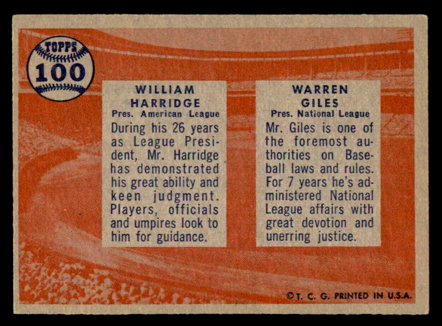 1957 Topps Baseball #100 Warren Giles William Harridge EX-MT 540028