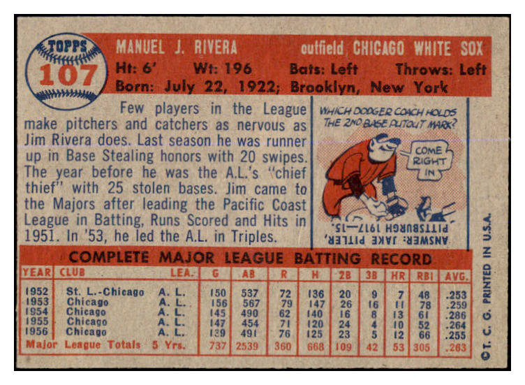 1957 Topps Baseball #107 Jim Rivera White Sox EX-MT 527655
