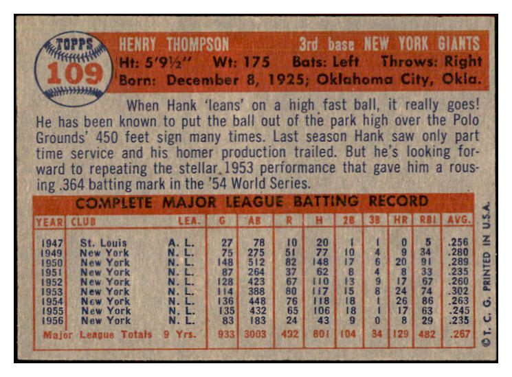 1957 Topps Baseball #109 Hank Thompson Giants NR-MT 534871