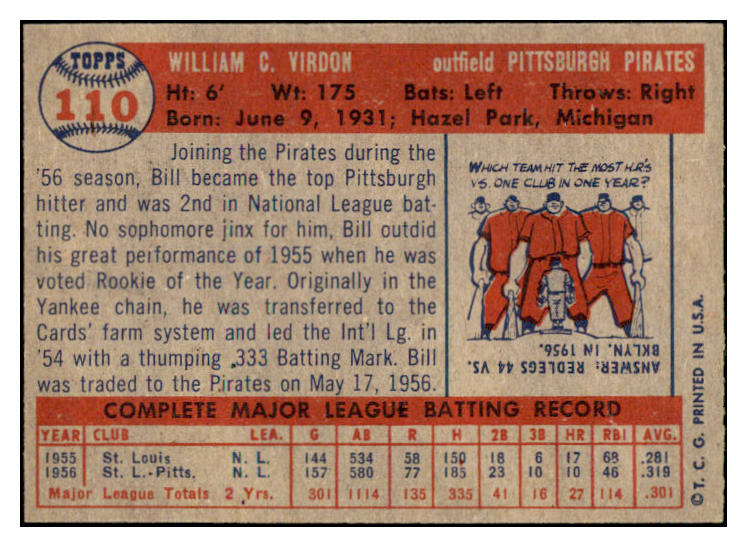 1957 Topps Baseball #110 Bill Virdon Pirates EX-MT 531028