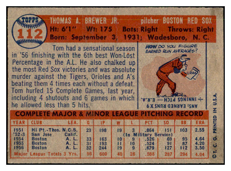 1957 Topps Baseball #112 Tom Brewer Red Sox EX-MT 535436