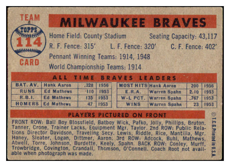 1957 Topps Baseball #114 Milwaukee Braves Team EX-MT 531674