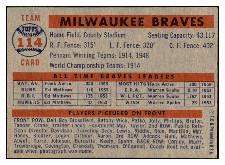 1957 Topps Baseball #114 Milwaukee Braves Team EX-MT 532734