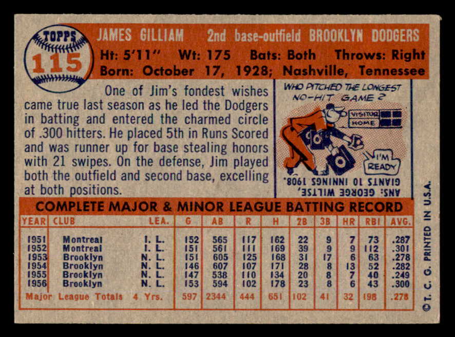 1957 Topps Baseball #115 Jim Gilliam Dodgers EX-MT 540025