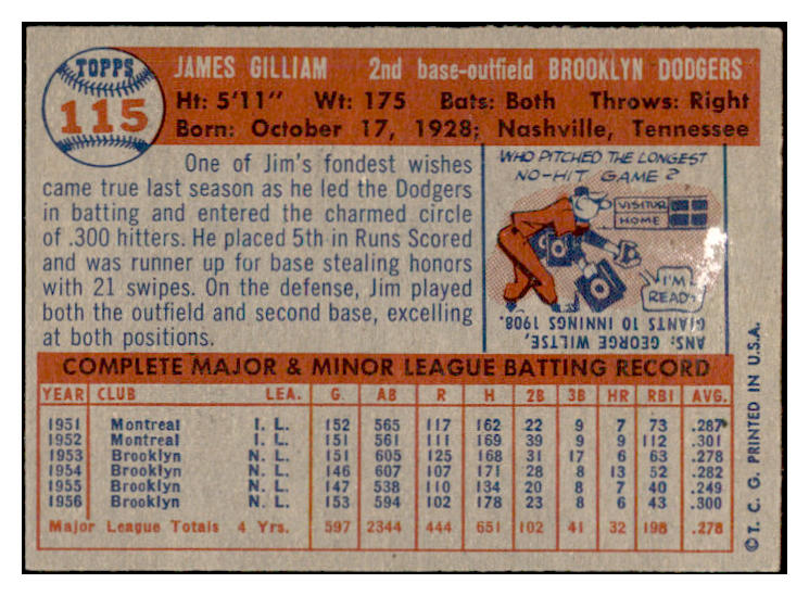 1957 Topps Baseball #115 Jim Gilliam Dodgers VG 532465