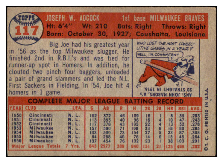 1957 Topps Baseball #117 Joe Adcock Braves EX-MT 527417
