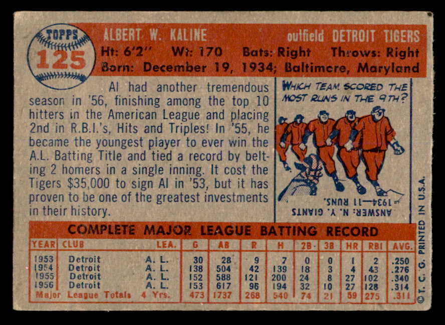 1957 Topps Baseball #125 Al Kaline Tigers EX 539338