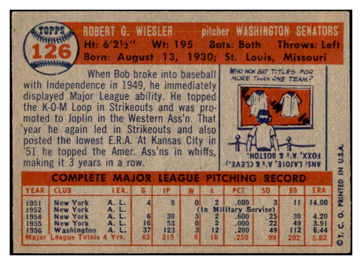 1957 Topps Baseball #126 Bob Wiesler Senators EX-MT 535439