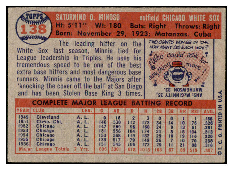 1957 Topps Baseball #138 Minnie Minoso White Sox EX 524950