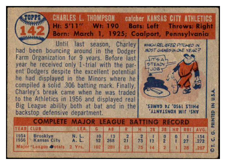 1957 Topps Baseball #142 Charley Thompson A's EX-MT 533791