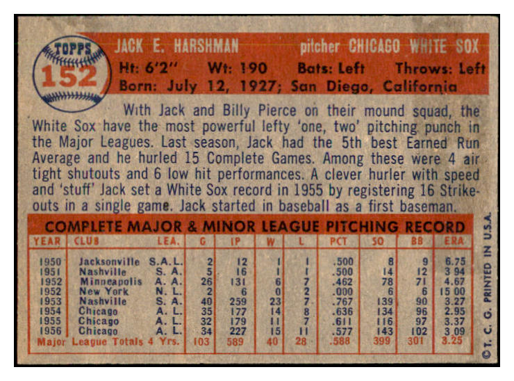 1957 Topps Baseball #152 Jack Harshman White Sox EX-MT 535451