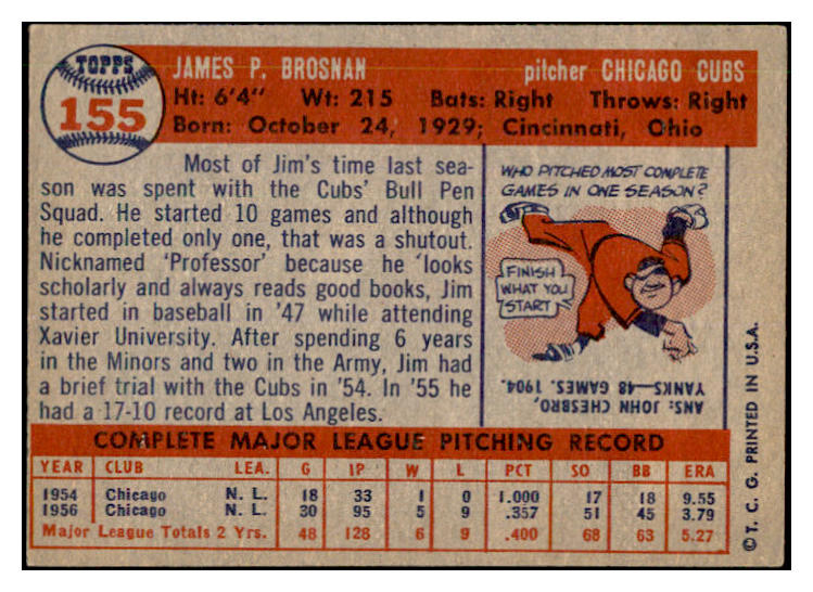 1957 Topps Baseball #155 Jim Brosnan Cubs EX-MT 535452