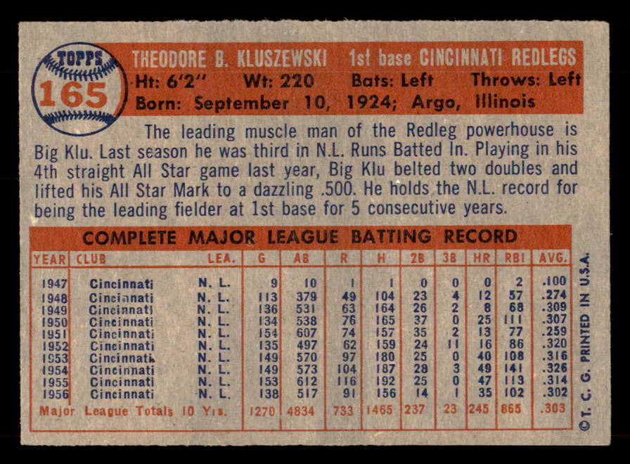 1957 Topps Baseball #165 Ted Kluszewski Reds EX-MT 546699