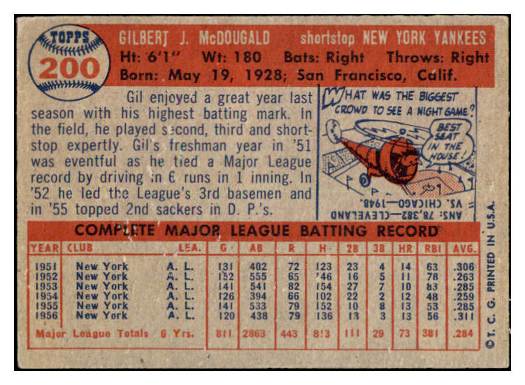 1957 Topps Baseball #200 Gil McDougald Yankees VG-EX 527529