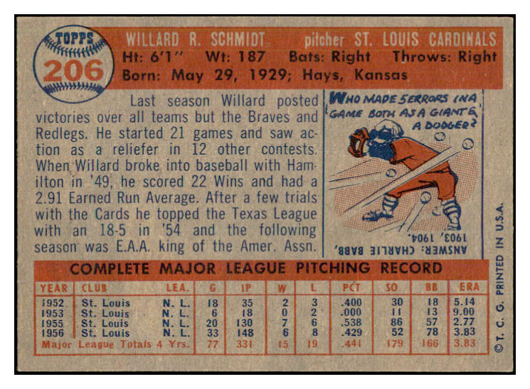 1957 Topps Baseball #206 Willard Schmidt Cardinals NR-MT 534878