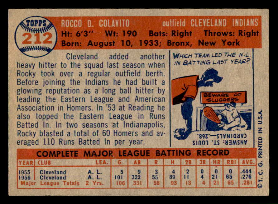 1957 Topps Baseball #212 Rocky Colavito Indians EX 540054
