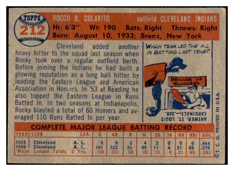 1957 Topps Baseball #212 Rocky Colavito Indians EX+/EX-MT 532481