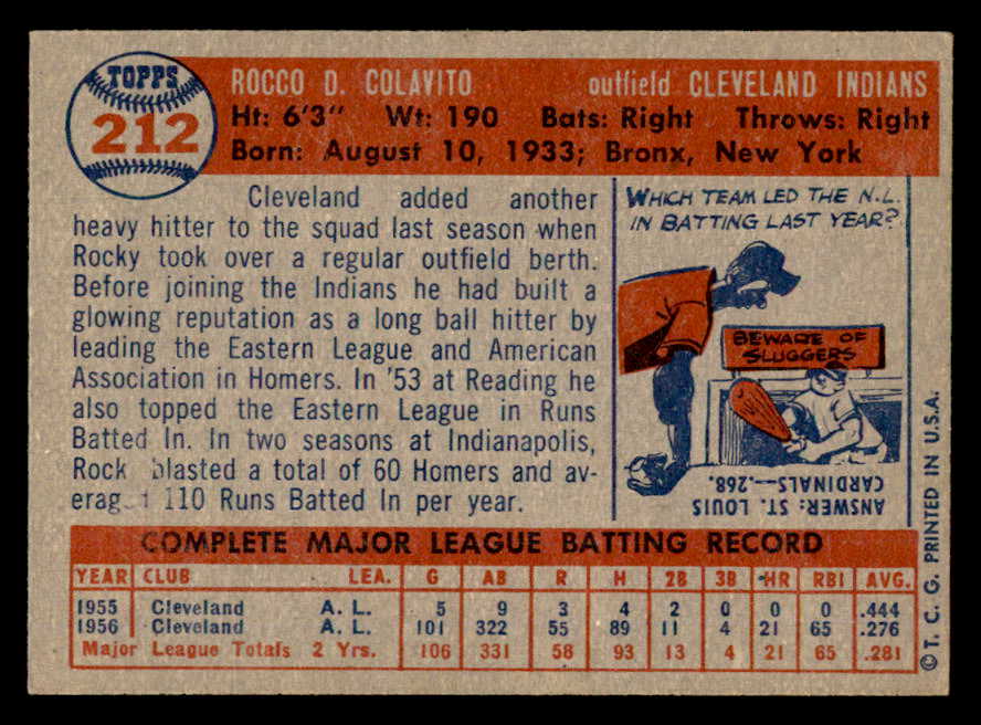 1957 Topps Baseball #212 Rocky Colavito Indians VG-EX 540055