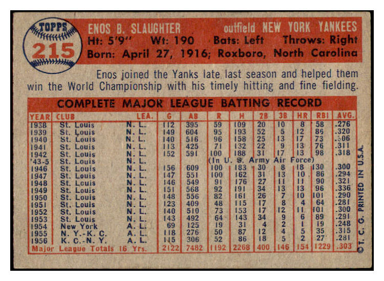 1957 Topps Baseball #215 Enos Slaughter Yankees EX-MT 530969