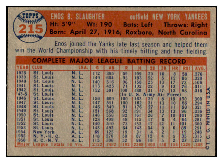 1957 Topps Baseball #215 Enos Slaughter Yankees EX-MT 532510