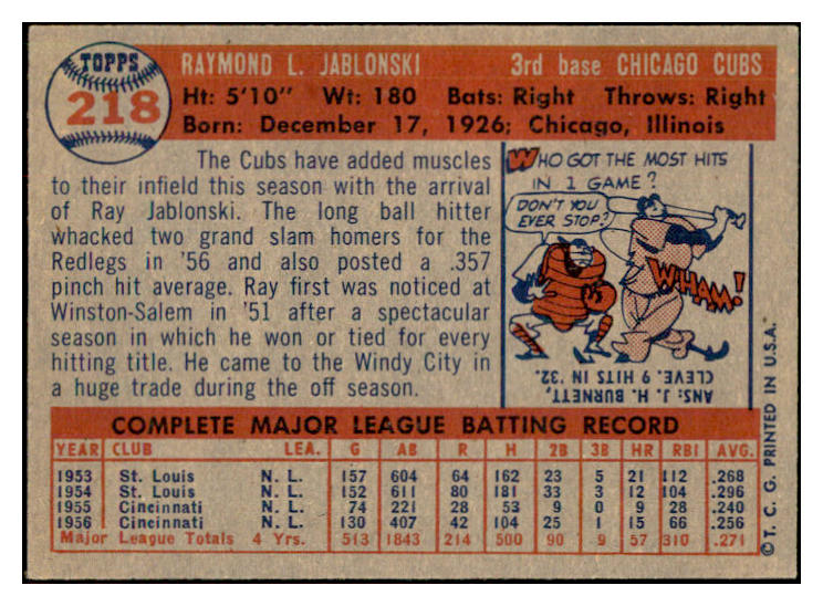 1957 Topps Baseball #218 Ray Jablonski Cubs NR-MT 534896