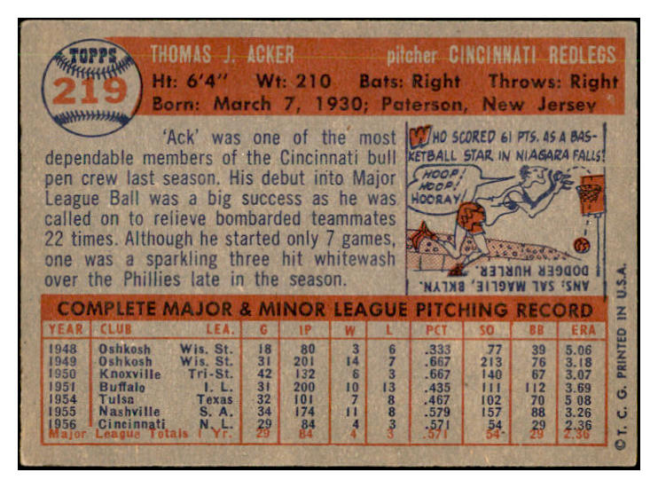 1957 Topps Baseball #219 Tom Acker Reds EX-MT 535481