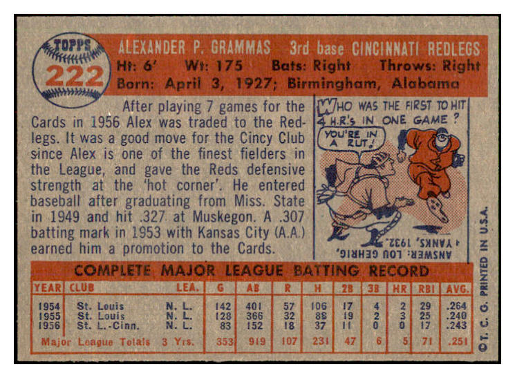 1957 Topps Baseball #222 Alex Grammas Reds NR-MT 534897