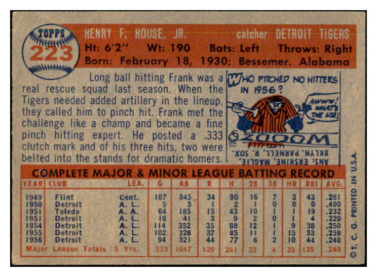 1957 Topps Baseball #223 Frank House Tigers EX-MT 535483