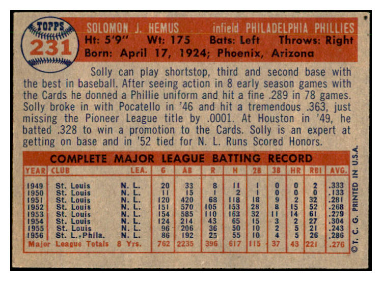 1957 Topps Baseball #231 Solly Hemus Phillies EX-MT 535486