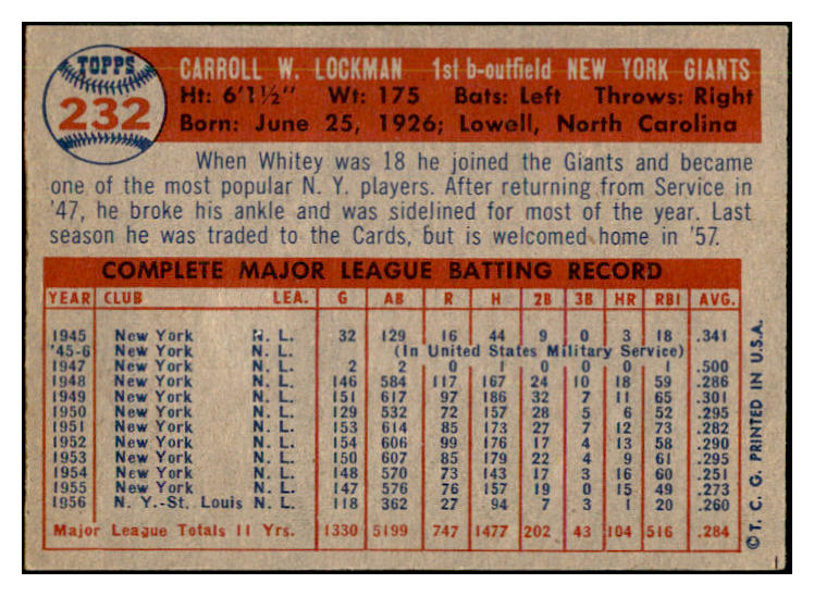 1957 Topps Baseball #232 Whitey Lockman Giants EX-MT 535487