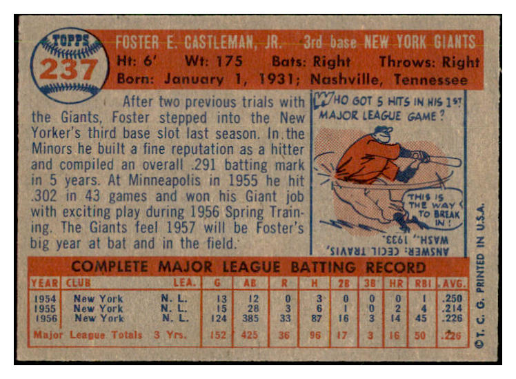 1957 Topps Baseball #237 Foster Castleman Giants EX-MT 535491