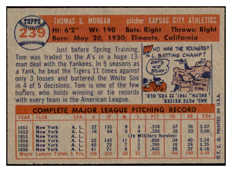 1957 Topps Baseball #239 Tom Morgan A's NR-MT 534903