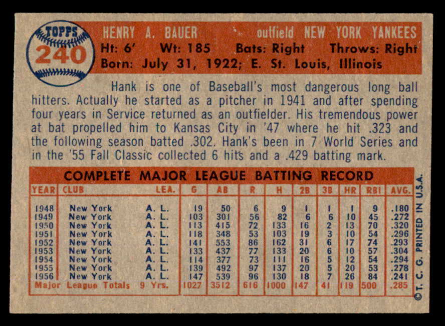 1957 Topps Baseball #240 Hank Bauer Yankees EX+/EX-MT 540030