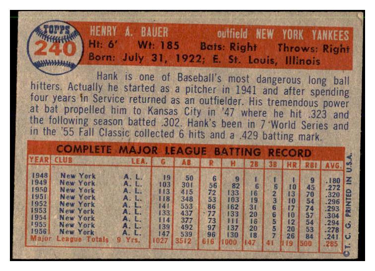 1957 Topps Baseball #240 Hank Bauer Yankees EX-MT 537407
