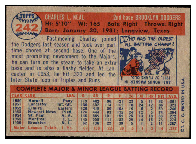 1957 Topps Baseball #242 Charlie Neal Dodgers EX-MT 527419