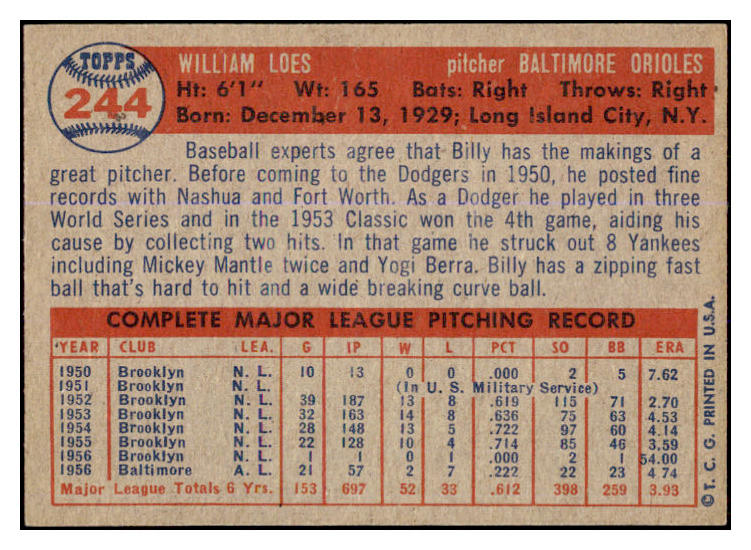 1957 Topps Baseball #244 Billy Loes Orioles EX-MT 527669