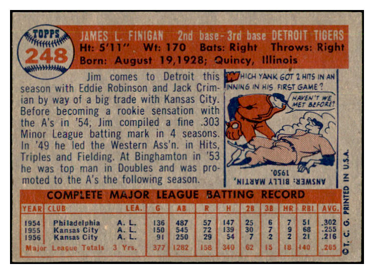 1957 Topps Baseball #248 Jim Finigan Tigers EX-MT 535497