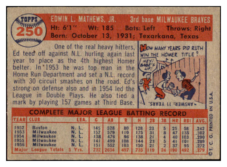 1957 Topps Baseball #250 Eddie Mathews Braves EX-MT 529057
