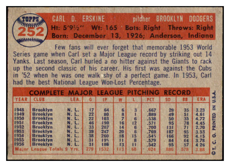 1957 Topps Baseball #252 Carl Erskine Dodgers EX-MT 531019