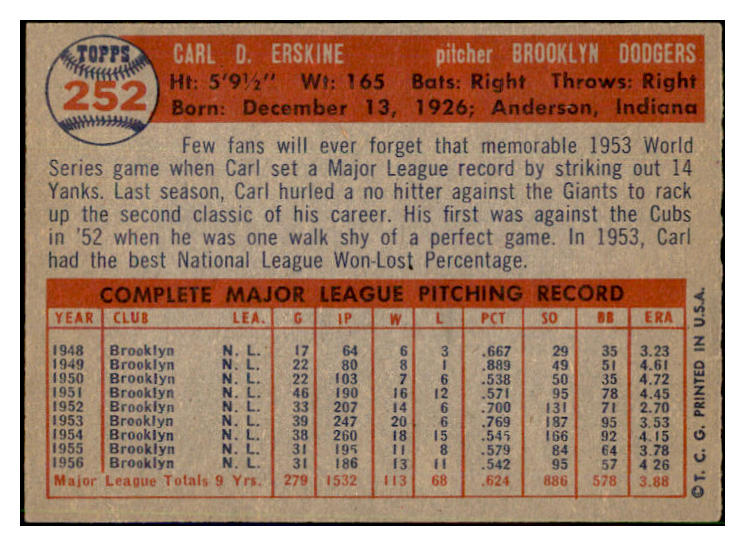 1957 Topps Baseball #252 Carl Erskine Dodgers EX-MT 532596
