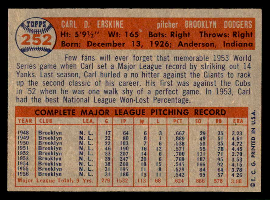 1957 Topps Baseball #252 Carl Erskine Dodgers EX-MT 540034