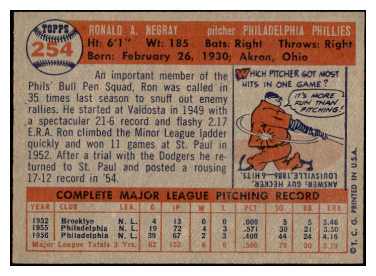 1957 Topps Baseball #254 Ron Negray Phillies NR-MT 534908