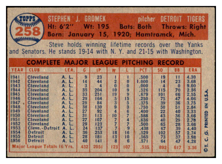 1957 Topps Baseball #258 Steve Gromek Tigers EX-MT 532566