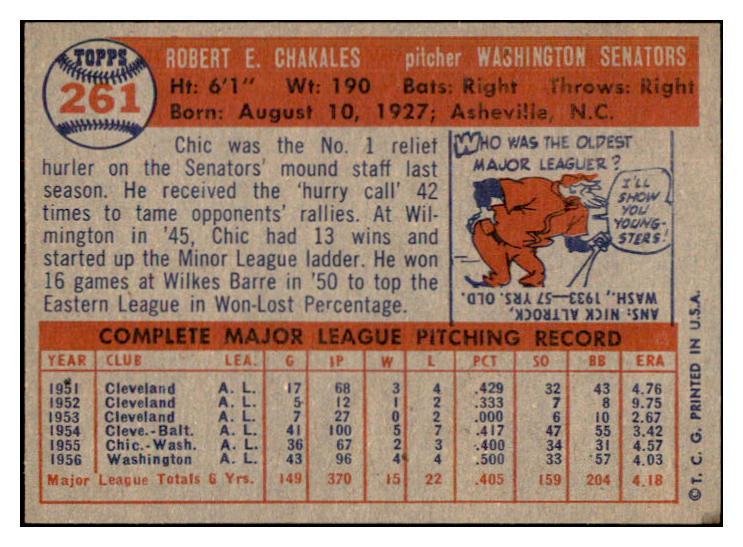 1957 Topps Baseball #261 Bob Chakales Senators EX-MT 534951