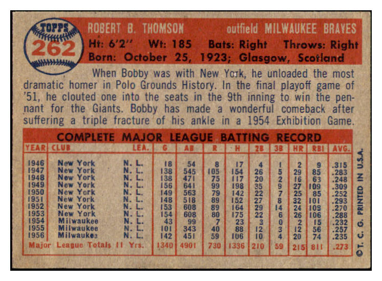 1957 Topps Baseball #262 Bobby Thomson Braves EX-MT 531018