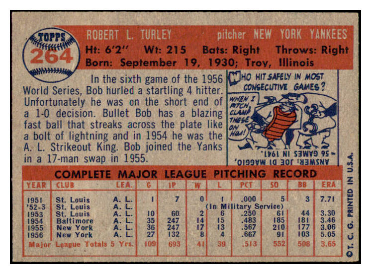 1957 Topps Baseball #264 Bob Turley Yankees EX 523804